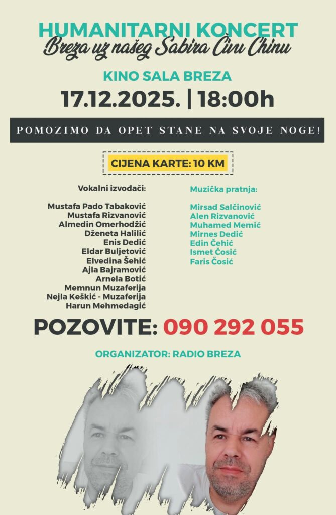 U Kino sali Breza 17. decembra 2025. godine u 18:00 sati bit će održan humanitarni koncert „Breza uz našeg Sabira Čivu – Ćinu“, s ciljem pružanja pomoći Sabiru Čivi – Ćini u njegovom oporavku i povratku svakodnevnom životu. Događaj organizuje Radio Breza, a veliki broj izvođača i muzičara odlučio je svojim učešćem podržati ovu akciju.