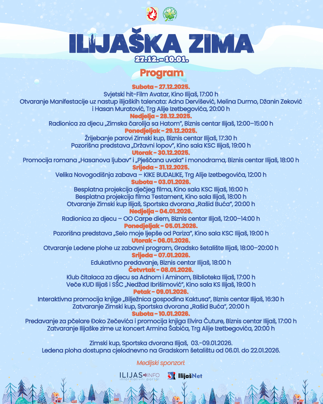 Ilijaška zima osmišljena je za sve generacije, a direktor Dervišević pozvao je građane da budu dio ove zimske čarolije i uživaju u bogatom programu koji nas očekuje tokom prazničnih dana, te zahvalio na podršci Općini Ilijaš, kao i medijskim sponzorima ilijas.net. ilijas.info, RTV Vogošća.