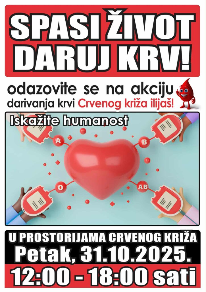 Crveni križ Ilijaš organizuje novu akciju darivanja krvi u petak, 31. oktobra 2025. godine, u prostorijama Crvenog križa Ilijaš, u terminu od 12:00 do 18:00 sati.