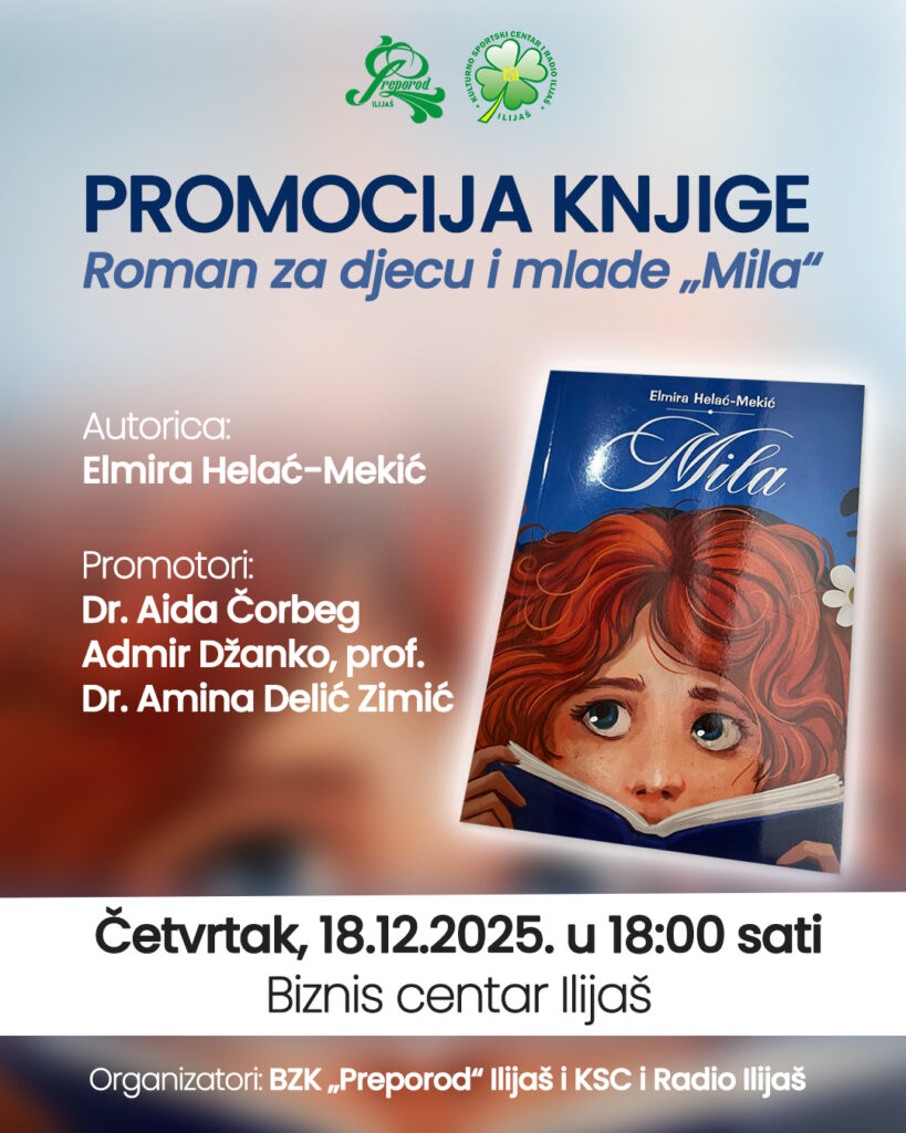 U organizaciji BZK „Preporod“ Ilijaš, Kulturno-sportskog centra i Radija Ilijaš, u četvrtak 18.12.2025. godine će biti upriličena promocija romana za djecu i mlade pod nazivom „Mila“, autorice Elmirе Helać-Mekić.