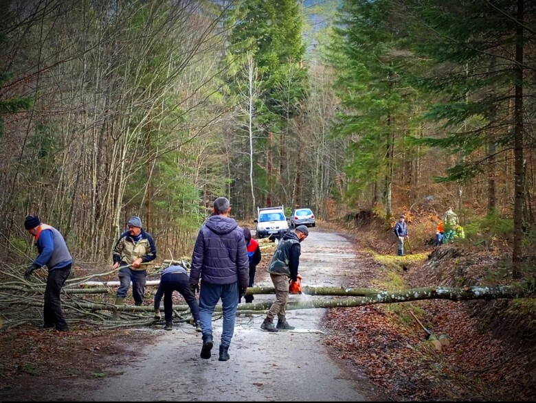 Među brojnim muškarcima koji učestvuju u radovima ističe se i Mina Salkanović, vrijedna mještanka koja rame uz rame sa ostalima uklanja stabla i grane, dajući primjer zajedništva i brige za lokalnu zajednicu.