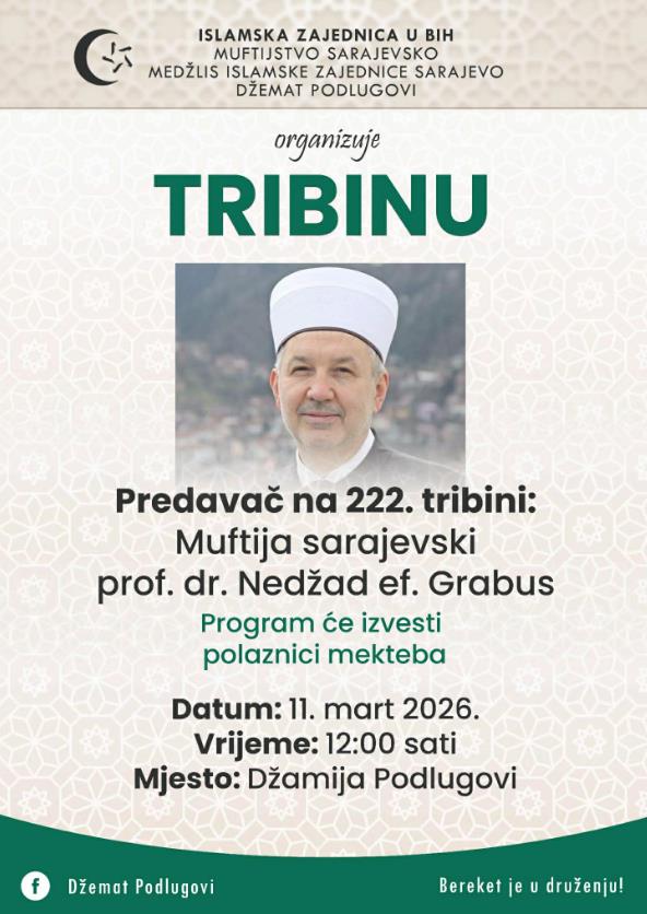 Riječ je o 222. tribini koju organizuje ovaj džemat, a događaj će biti održan u srijedu, 11. marta 2026. godine, u džamiji Podlugovi sa početkom u 12:00 sati.