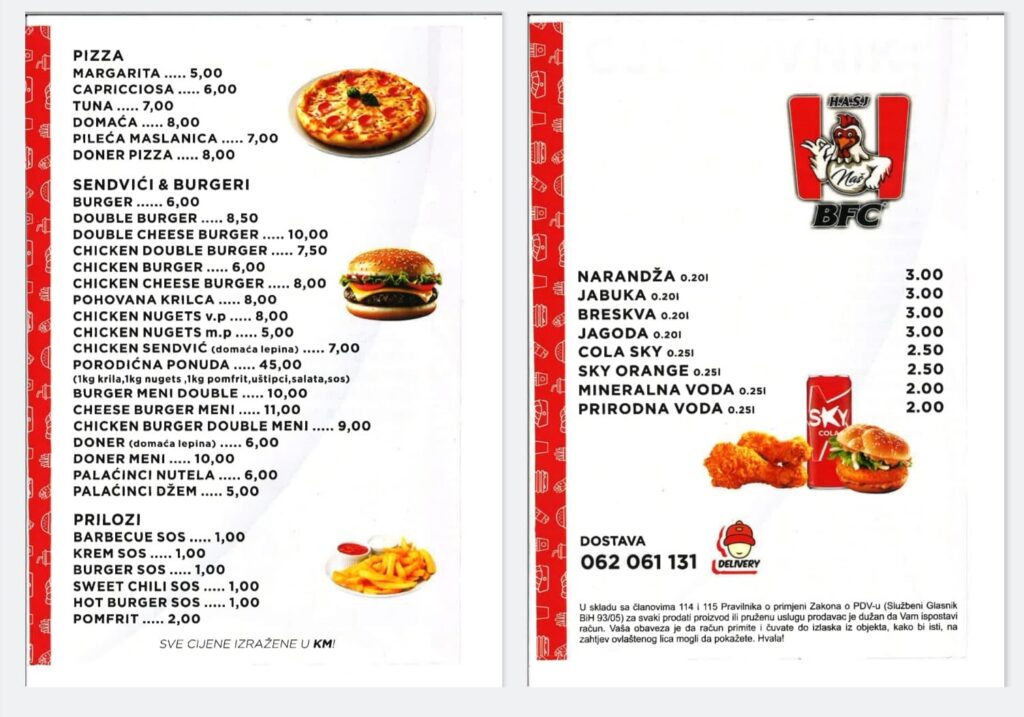 Fast food BFC Ilijaš nastavlja svoju praksu pružanja svježih i kvalitetnih obroka, a kompletan meni i cijene dostupni su u nastavku.