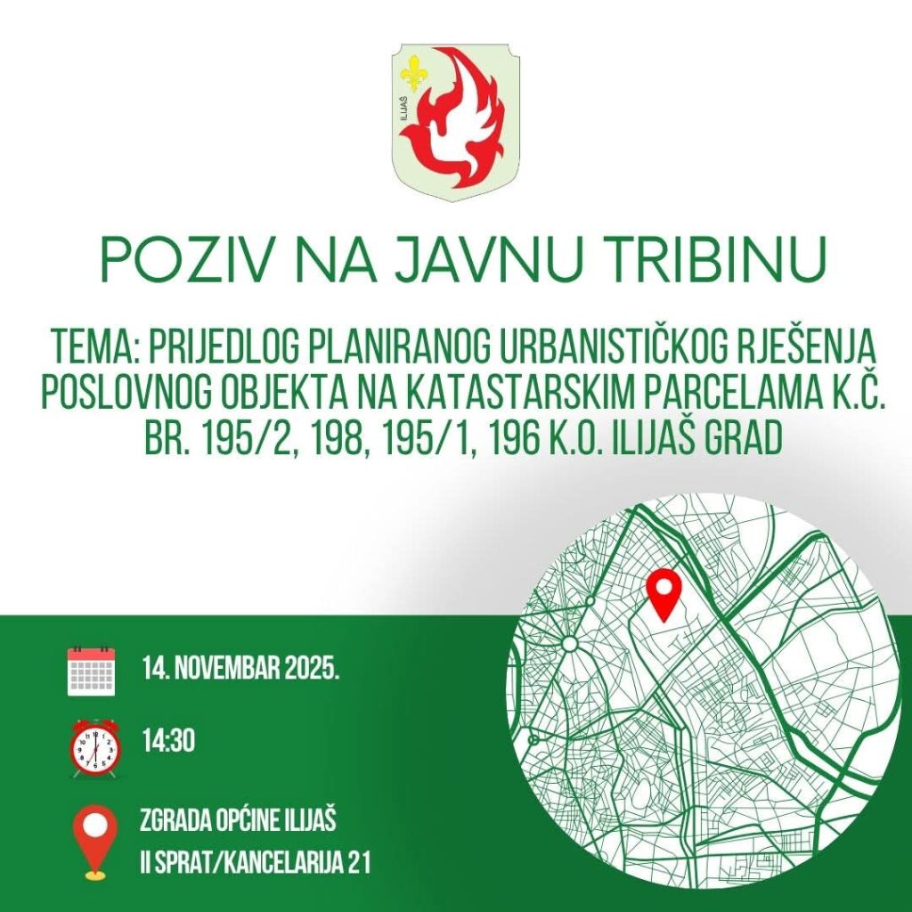 U skladu sa članom 7. Odluke o pristupanju izradi Izmjene i dopune Regulacionog plana “BANOVAC” izgradnja stambeno-poslovnog kompleksa na k.č. br. 195/2, 198, 195/1, 196 K.O. Ilijaš grad u Ilijašu (Službene novine Kantona Sarajevo broj 28/24) – lokalitet preko puta poslovnice Vodostana i Reciklažnog dvorišta, organizuje se Javna tribina na temu Prijedloga planiranog urbanističkog rješenja poslovnog objekta na navedenim katastarskim parcelama.