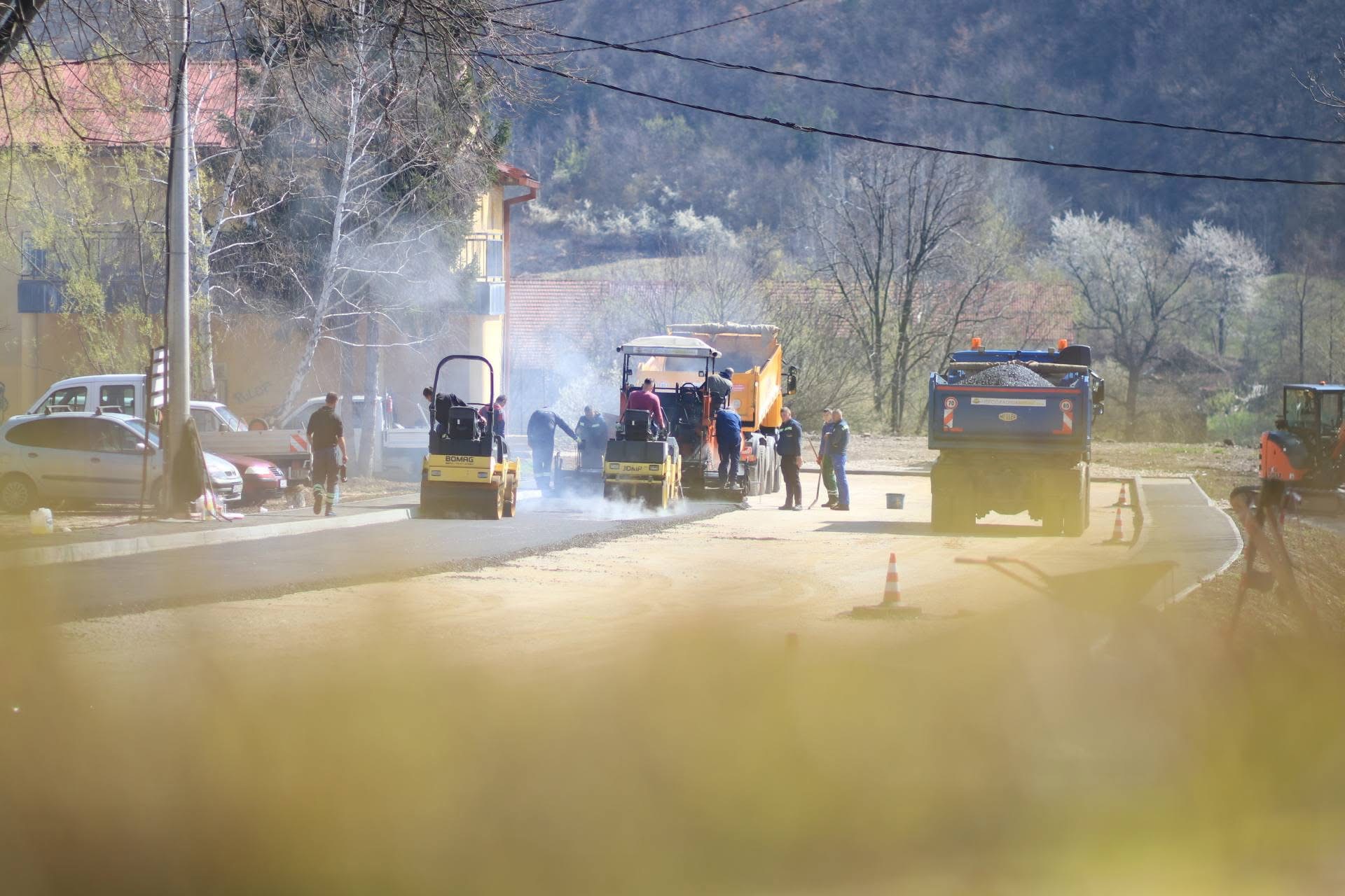 Kod kina u Općina Breza jutros su započeli radovi na asfaltiranju prostora koji obuhvata saobraćajnicu, parking i taxi stajalište.
