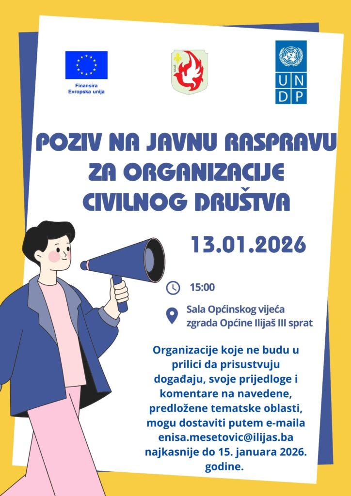Regionalni program lokalne demokratije na Zapadnom Balkanu 3 (ReLOaD3), koji finansira Evropska unija, a provodi Razvojni program Ujedinjenih nacija (UNDP), u partnerstvu sa Općinom Ilijaš, poziva organizacije civilnog društva (OCD) i zainteresirane građane/ke da prisustvuju Javnoj raspravi o tematskim oblastima koje će biti finansirane kroz predstojeći Javni poziv.