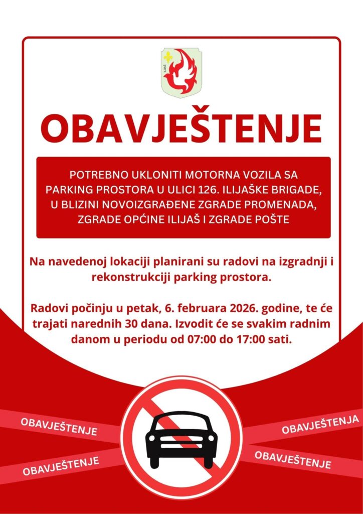 Iz Općine Ilijaš obavještavaju građane da je neophodno ukloniti motorna vozila sa parking prostora u ulici 126. ilijaške brigade, u blizini novoizgrađene zgrade Promenada, zgrade Općine Ilijaš i zgrade Pošte u Ilijašu.