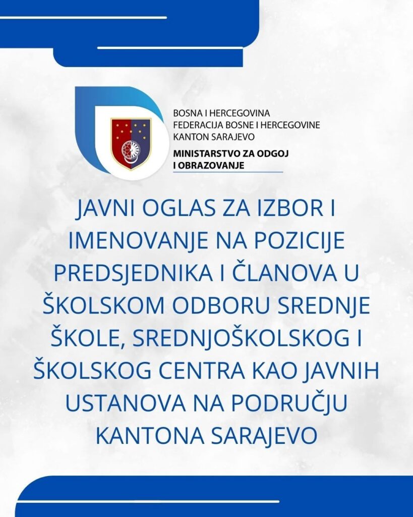 Ministarstvo za odgoj i obrazovanje Kantona Sarajevo raspisalo je Javni poziv za izbor i imenovanje na pozicije predsjednika i članova u školskim odborima osnovnih škola kao javnih ustanova na području Kantona Sarajevo, čija konačna imenovanja vrši Vlada Kantona Sarajevo, na mandatni period od četiri godine.