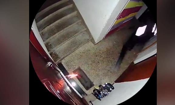 Na videosnimku se vidi osoba s kapuljačom kako prilazi vratima stana, potom ispred njih ostavlja veliku petardu, tzv. “topovski udar”, pali je i brzo se udaljava. Nekoliko trenutaka kasnije uslijedila je snažna eksplozija koja je uznemirila stanare zgrade.