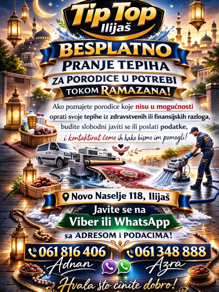 Ramazan je mjesec dobrih djela, solidarnosti i međusobne podrške, a upravo u tom duhu firma Tip Top Ilijaš pokrenula je humanu akciju besplatnog pranja tepiha za porodice koje nisu u mogućnosti same finansirati ovu uslugu.