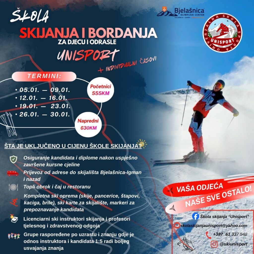 Škola skijanja i bordanja „Unisport“ i ove zime organizuje zimsku školu na Bjelašnici, namijenjenu djeci i odraslima, uz mogućnost grupnih i individualnih časova. Program je prilagođen početnicima i naprednim polaznicima, a odvija se na jednom od najpoznatijih olimpijskih skijališta u Bosni i Hercegovini.