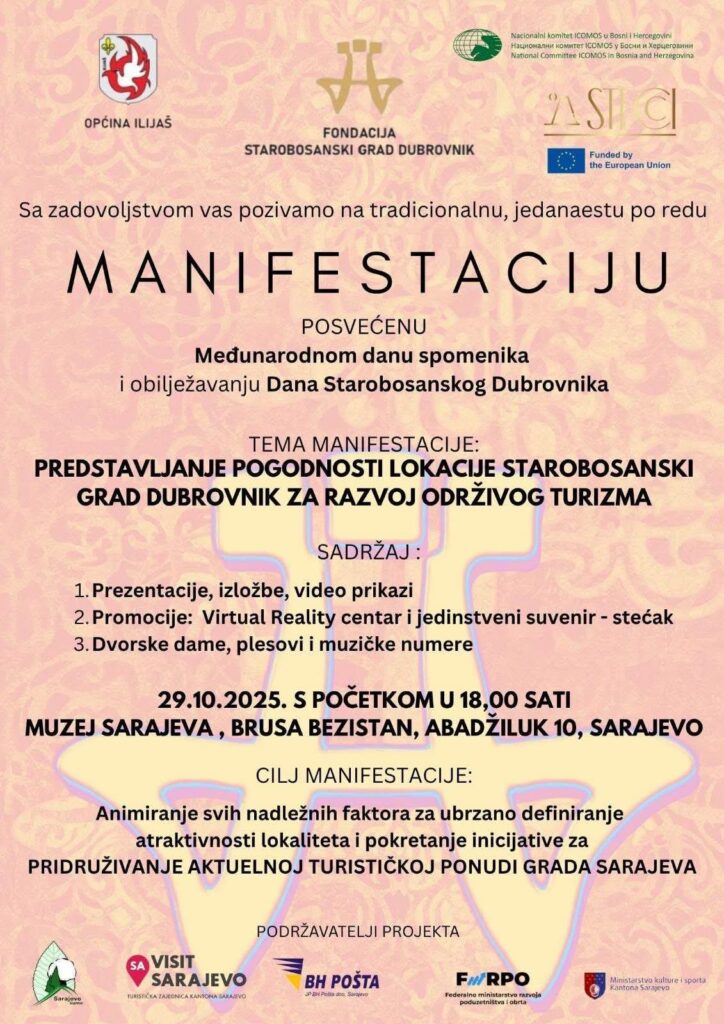 U Muzeju Sarajeva, u prostoru Brusa bezistana, 29. oktobra 2025. godine s početkom u 18 sati, bit će održana tradicionalna, jedanaesta po redu manifestacija posvećena Međunarodnom danu spomenika i obilježavanju Dana Starobosanskog Dubrovnika kod Ilijaša.