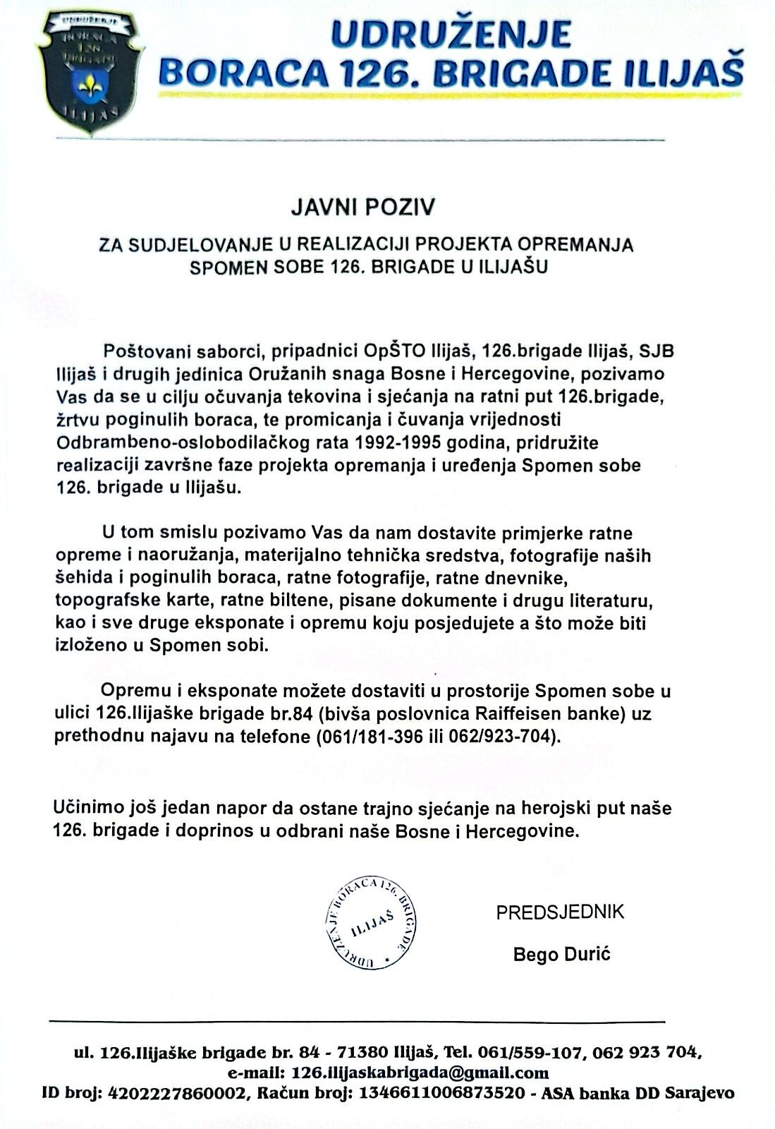 Udruženje boraca 126. brigade Ilijaš uputilo je javni poziv za učešće u realizaciji završne faze projekta opremanja i uređenja Spomen sobe 126. brigade u Ilijašu.
