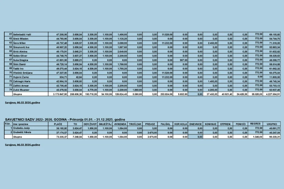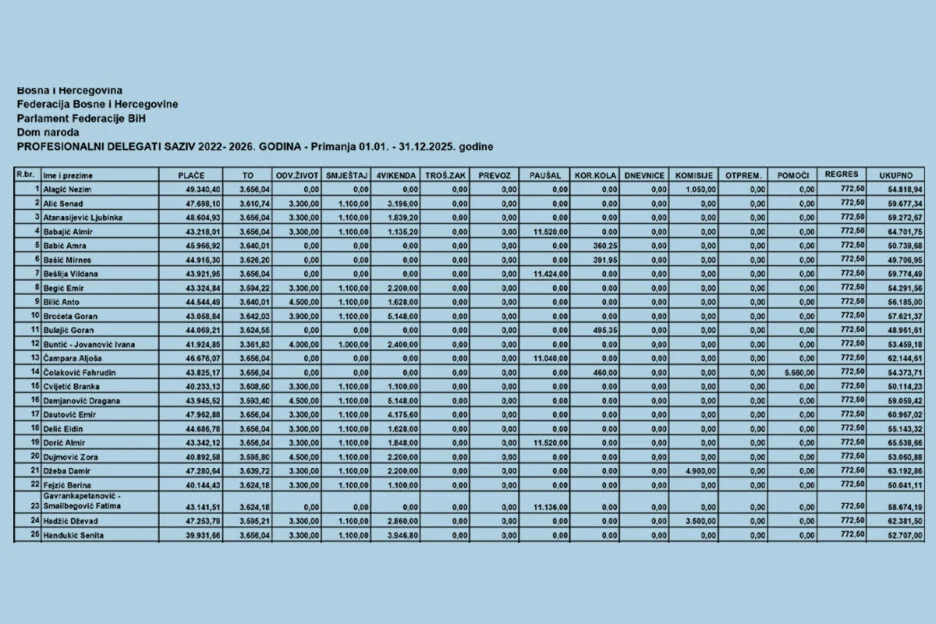 Za 74 delegata u Domu naroda Parlamenta Federacije Bosne i Hercegovine u 2025. godini isplaćeno je ukupno 4.227.564 KM iz budžeta.