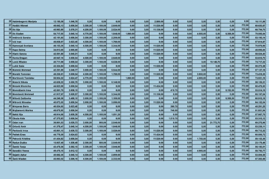 Ostali delegati su zaradili nešto manje. Tako je Aida Obuća (SDA) zaradila 53.315 KM, Haris Zahiragić (SDA) inkasirao je 48.745 KM, Aljoša Čampara (NiP) 62.144 KM i Vildana Bešlija (Naša stranka) 59.774 KM.