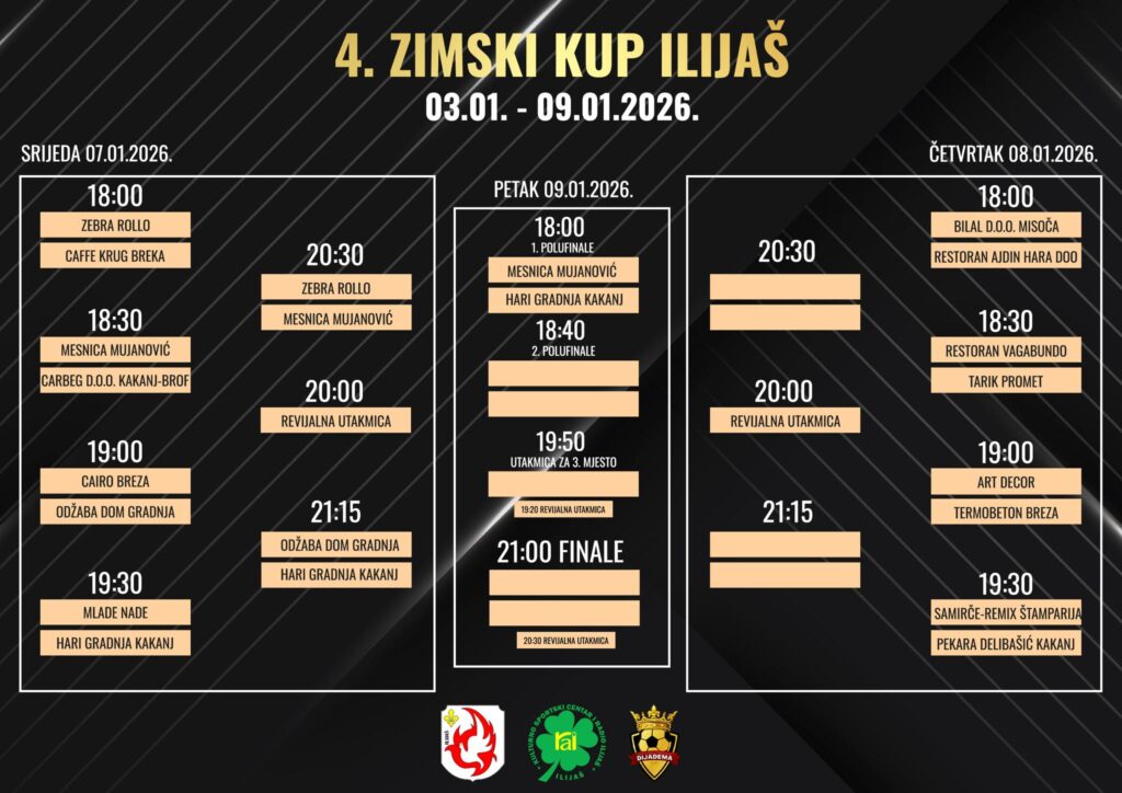 Sutra, 9. januara, u Sportskoj dvorani Rašid Buća u Ilijašu biće upriličeno svečano zatvaranje turnira u malom fudbalu „Zimski kup Ilijaš“. U okviru završnice turnira na rasporedu su posljednje i najuzbudljivije utakmice – polufinalni susreti, meč za treće mjesto, kao i veliko finale koje će odlučiti ovogodišnjeg pobjednika.